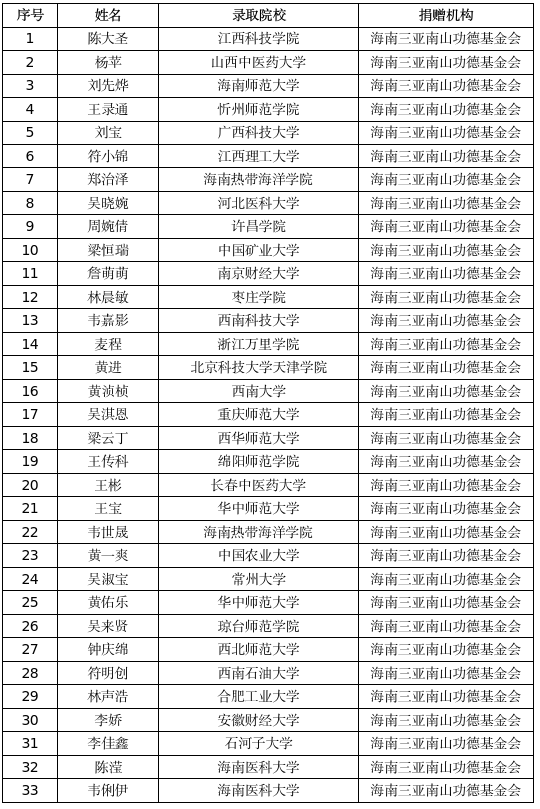 根据2025年海南希望工程助力乡村振兴圆梦行动实施方案,经过“海南三亚南山功德基金会”认捐,各市、县(区)团委入户调查审核,现将拟资助大学生向社会公示,公示期为3天。如有异议者,请拨打海南省青少年希望基金会办公室电话0898-65357770反映情况。如发现受助生信息不实、品学不佳等情况,主办单位有权取消其受助资格。
